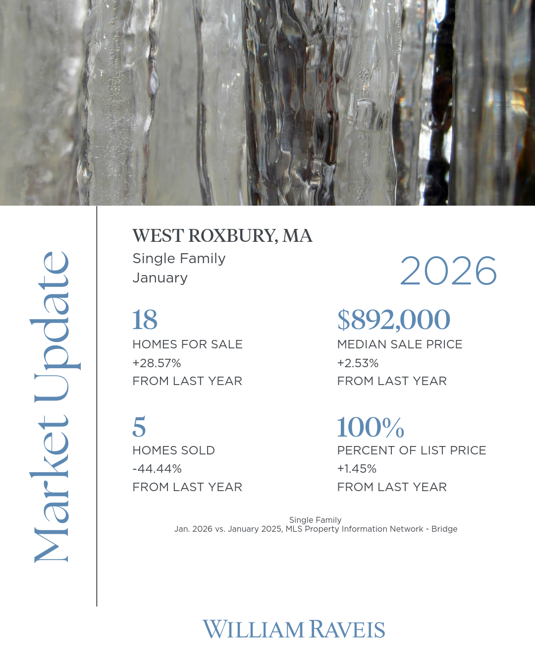 In West Roxbury, the January 2026 single-family market showed a mix of tight supply and steady pricing. There were 18 homes for sale, up 28.57% from last year, while 5 homes sold a 44.44% decrease year over year, reflecting slower winter activity. The median sale price reached $892,000, a 2.53% increase from January 2025, and homes sold at 100% of list price on average, slightly higher than last year. Overall, while sales volume was lighter, pricing remained stable and competitive, reinforcing continued demand in this neighborhood.