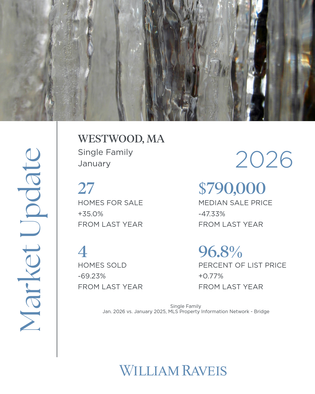 In Westwood, the January 2026 single-family market reflected typical winter slowdowns with shifting dynamics year over year. There were 27 homes for sale, a 35% increase compared to last January, while 4 homes sold, down 69.23% from a year ago. The median sale price was $790,000, lower than last year’s January figure, though homes still sold for an average of 96.8% of list price, slightly higher than a year ago. Overall, inventory has grown modestly, sales activity was lighter, and buyers remained price-conscious, yet well-positioned homes continued to command strong interest.